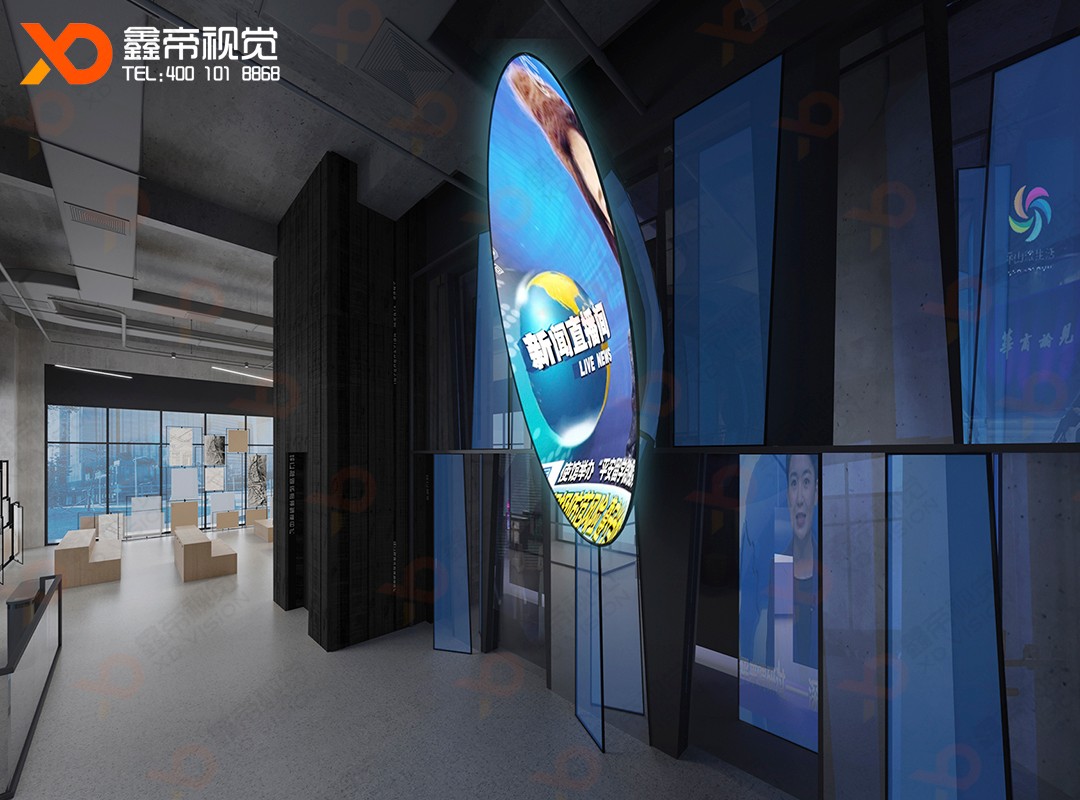 在升降電梯的四周,有設(shè)計幾十條走字的LED屏,講述著融媒的設(shè)計理念和文化內(nèi)涵。