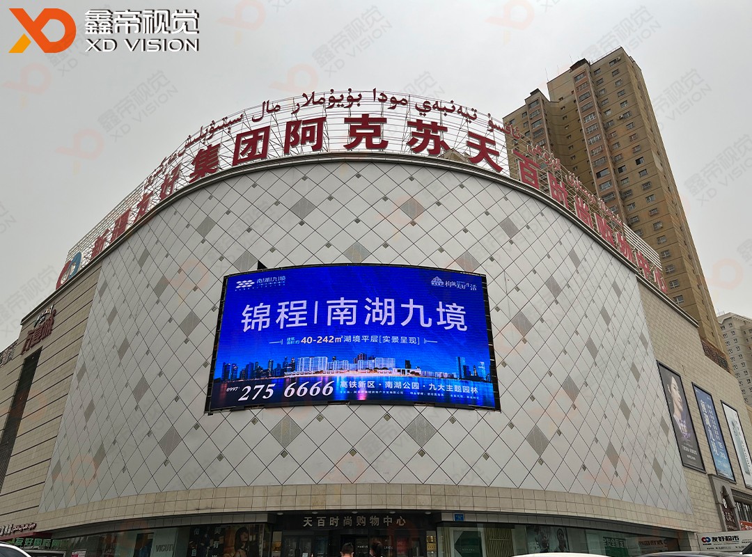 新疆友好集團(tuán)阿克蘇天百時(shí)尚購(gòu)物中心戶外高亮度高刷新項(xiàng)目安裝點(diǎn)亮完成,此項(xiàng)目由深圳市鑫帝視覺承建,獲得客戶高度好評(píng)!