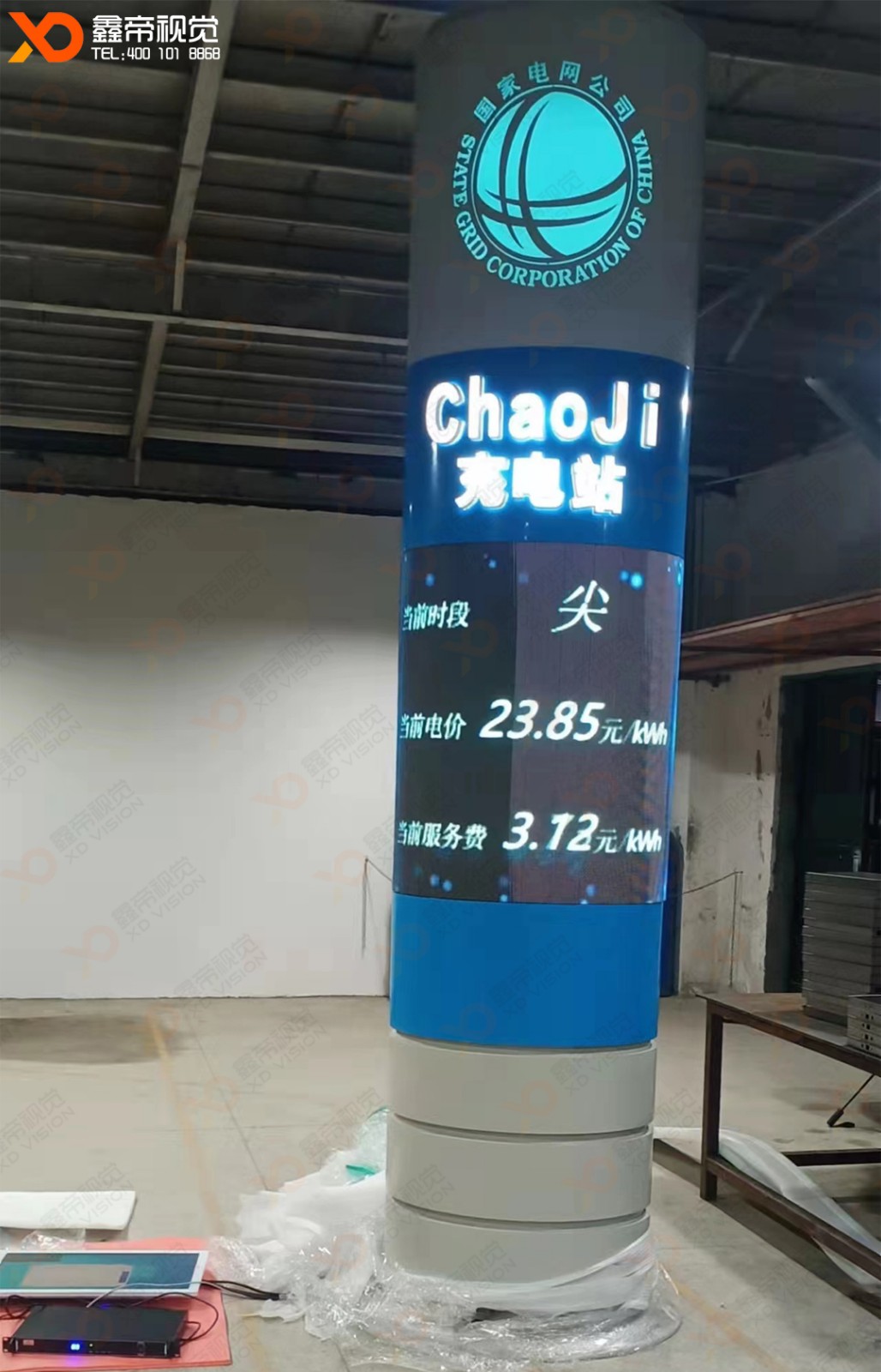 國(guó)家電網(wǎng)公司戶外LED橢圓柱充電站由鑫帝視覺(jué)獨(dú)家定制,整個(gè)柱子設(shè)計(jì)是橢圓柱子形狀,其中LED部分采用鑫帝視覺(jué)開模定制的80mm*320mm的戶外P4板子,國(guó)星+2153高刷IC,完美呈現(xiàn)客戶想要的效果!