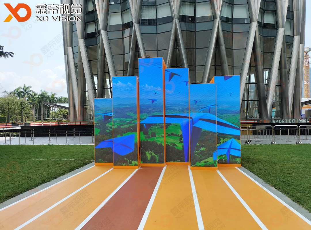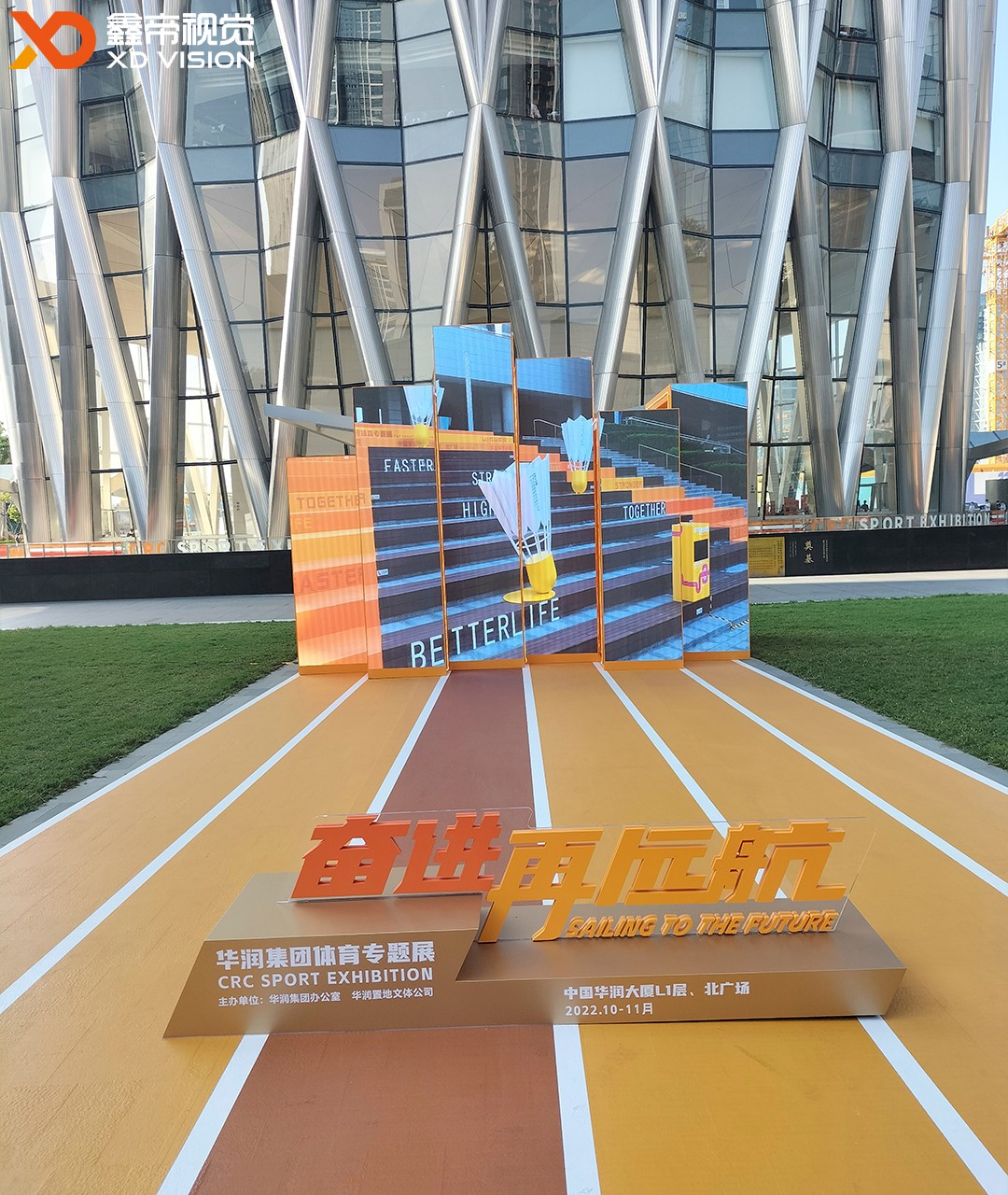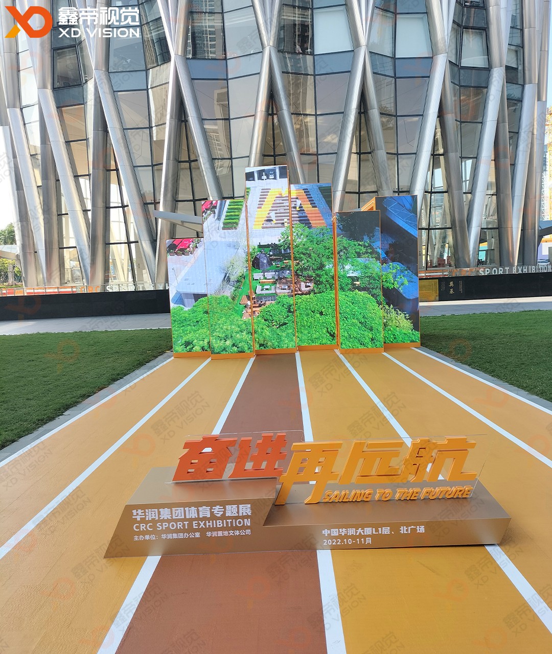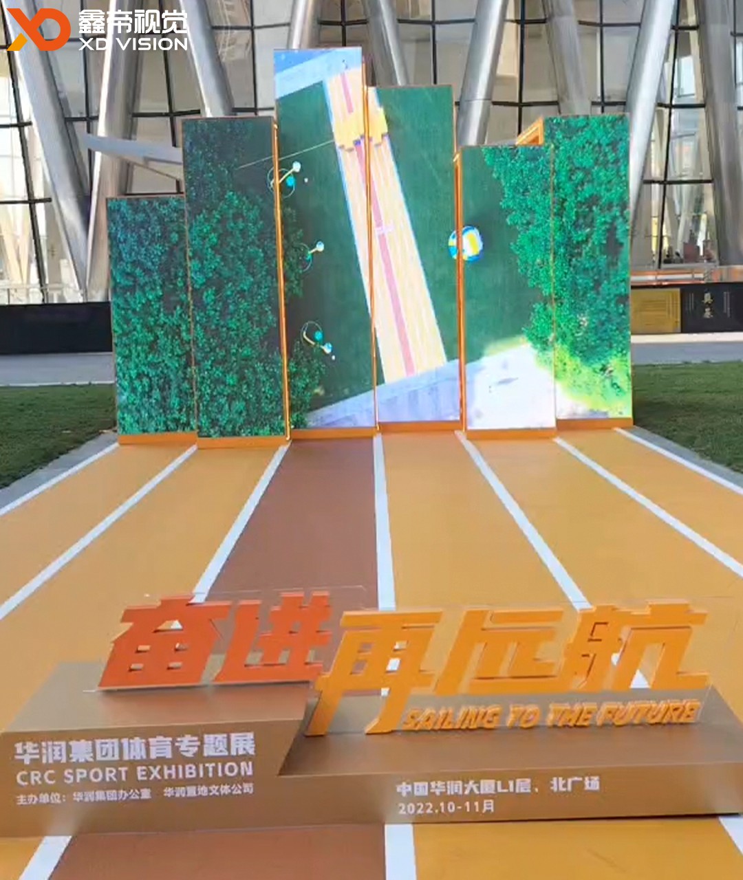 該展項鑫帝視覺結(jié)合華潤的企業(yè)文化和文體之路打造,采用P2.5戶外高清高刷LED顯示屏進行錯落式排布,從正面看,他能讓視頻圖像更加立體,展現(xiàn)出華潤“健康中國”“體育強國”戰(zhàn)略目標;從側(cè)面看,更像是華潤“十年文體耕耘路”的形象表達。獲得客戶的高度好評!