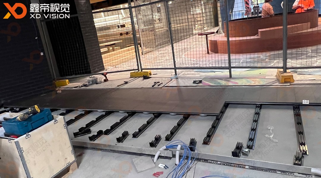 澳大利亞分公司LED互動地磚屏項目安裝調(diào)試中,鑫帝視覺LED互動地磚屏是專門為地面顯示而打造的LED顯示屏,在承重、防護性能及散熱等方面都做過特殊設(shè)計,使其能適應高強度踩踏,長時間正常運行。