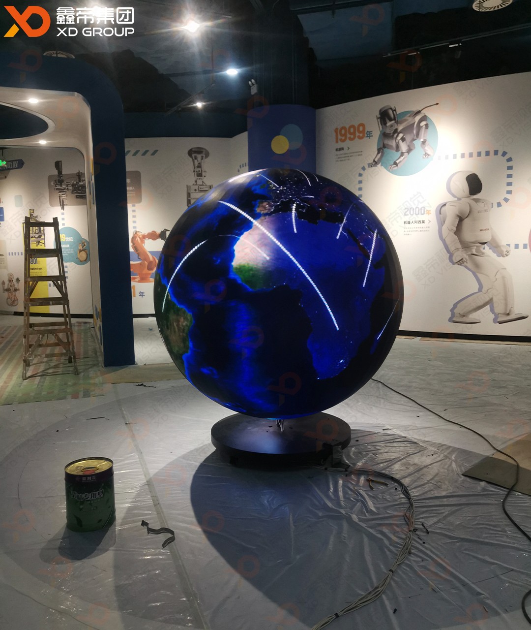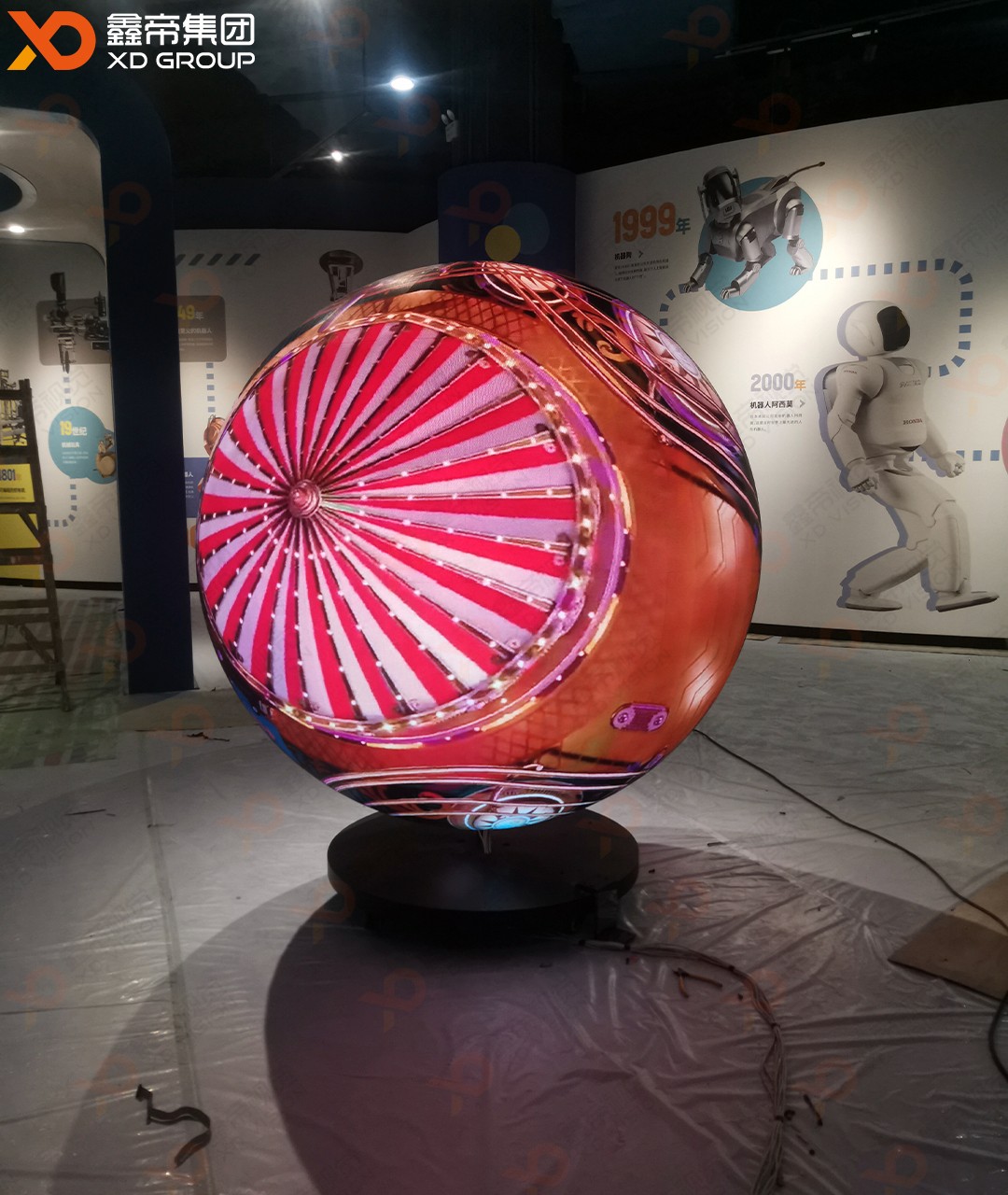 走進(jìn)博物館,首先映入眼簾的是鑫帝集團(tuán)精心打造的直徑1.8米P2 LED球形屏。這款球形屏以其獨(dú)特的造型設(shè)計(jì)和超高清的顯示效果,瞬間成為全場(chǎng)焦點(diǎn)。P2的像素間距確保了每一個(gè)細(xì)節(jié)都纖毫畢現(xiàn),無論是動(dòng)態(tài)影像還是靜態(tài)畫面,都能展現(xiàn)出令人驚嘆的清晰度和色彩飽和度。360°全景視角,讓觀眾無論從哪個(gè)角度觀看,都能沉浸在這份科技帶來的視覺震撼之中。這不僅是一次技術(shù)的展示,更是科技與藝術(shù)完美融合的典范。