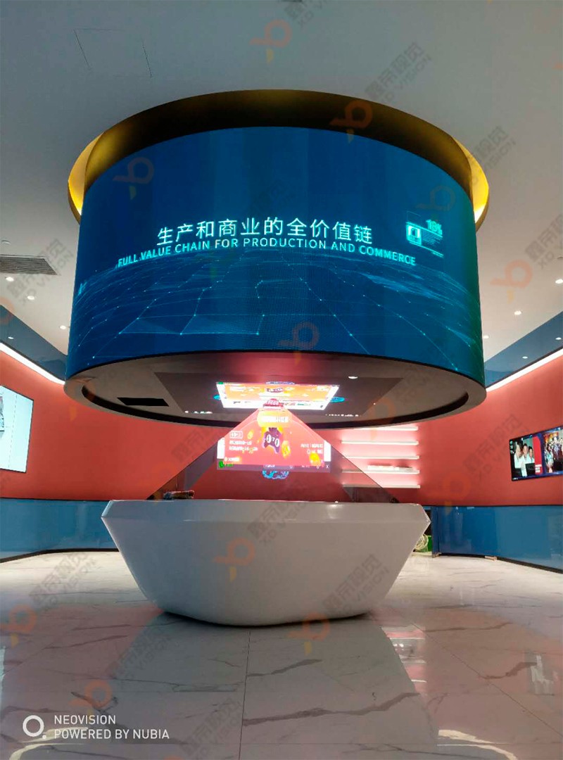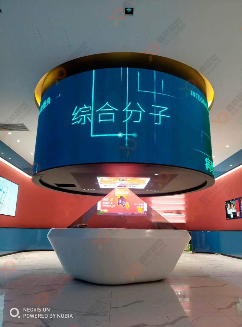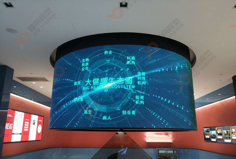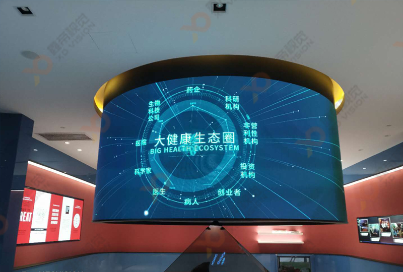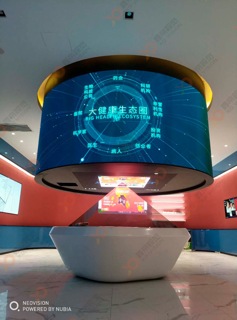 2018年10月鑫帝視覺VR+LED創(chuàng)意顯示亮相藥明康德展示廳,為來訪參觀客人展示公司品牌形象、公司發(fā)展方向、公司產(chǎn)品和行業(yè)動向。項目的頂部是一個360度的P1.2小間距圓環(huán)設(shè)計,無死角受眾覆蓋面,提高LED顯示屏的整體美觀度,吸引眼球。圓環(huán)底部是一塊結(jié)合VR的P1.2小間距,讓VR+LED創(chuàng)意顯示屏和醫(yī)療結(jié)合在一起,VR可以模擬藥物、設(shè)備和人體結(jié)構(gòu),進(jìn)行虛擬和半實物實驗,能簡化操作,并避免人為操作帶來的實驗誤差和污染,而LED顯示屏能更加清晰的展現(xiàn)給到觀眾。