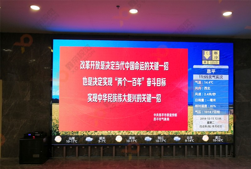 廣東恩平氣象局展示廳LED顯示屏項(xiàng)目安裝點(diǎn)亮完成,此項(xiàng)目采用鑫帝視覺XD-ISMD系列戶內(nèi)固裝屏,此系列產(chǎn)品有以下優(yōu)勢: