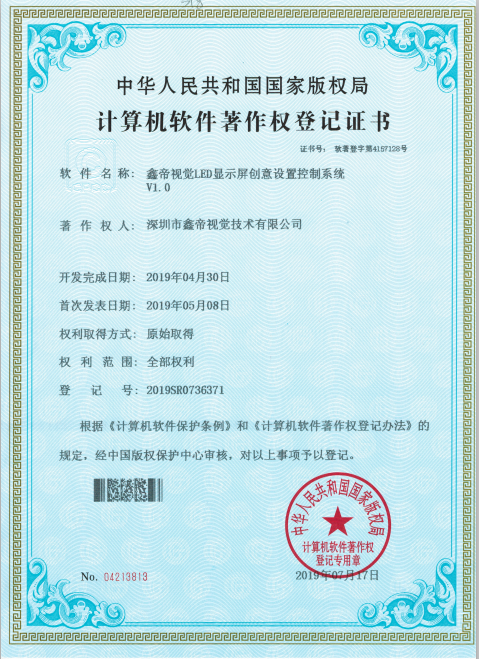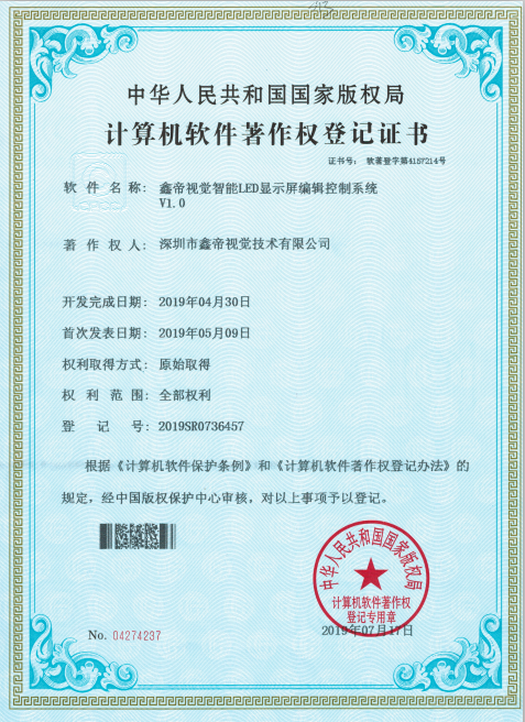 鑫帝公司自主研發(fā)的“LED顯示屏創(chuàng)意設(shè)置系統(tǒng)”和“智能LED顯示屏編輯系統(tǒng)”正式下達(dá)證書!