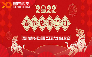 在2022年春節(jié)到來(lái)之際,首先感謝各位對(duì)我司長(zhǎng)期以來(lái)的信任及大力支持,也希望在新的一年里能繼續(xù)得到您們的幫助與關(guān)照,在此深圳市鑫帝視覺(jué)全體員工祝您及您的家人新春快樂(lè)、闔家幸福、身體健康、萬(wàn)事如意!