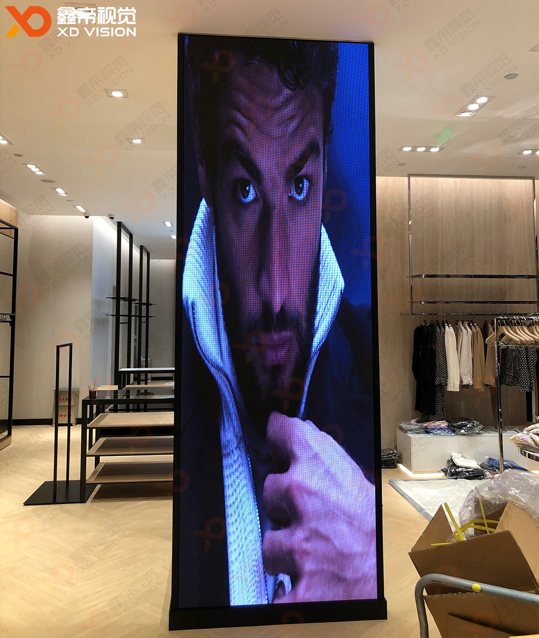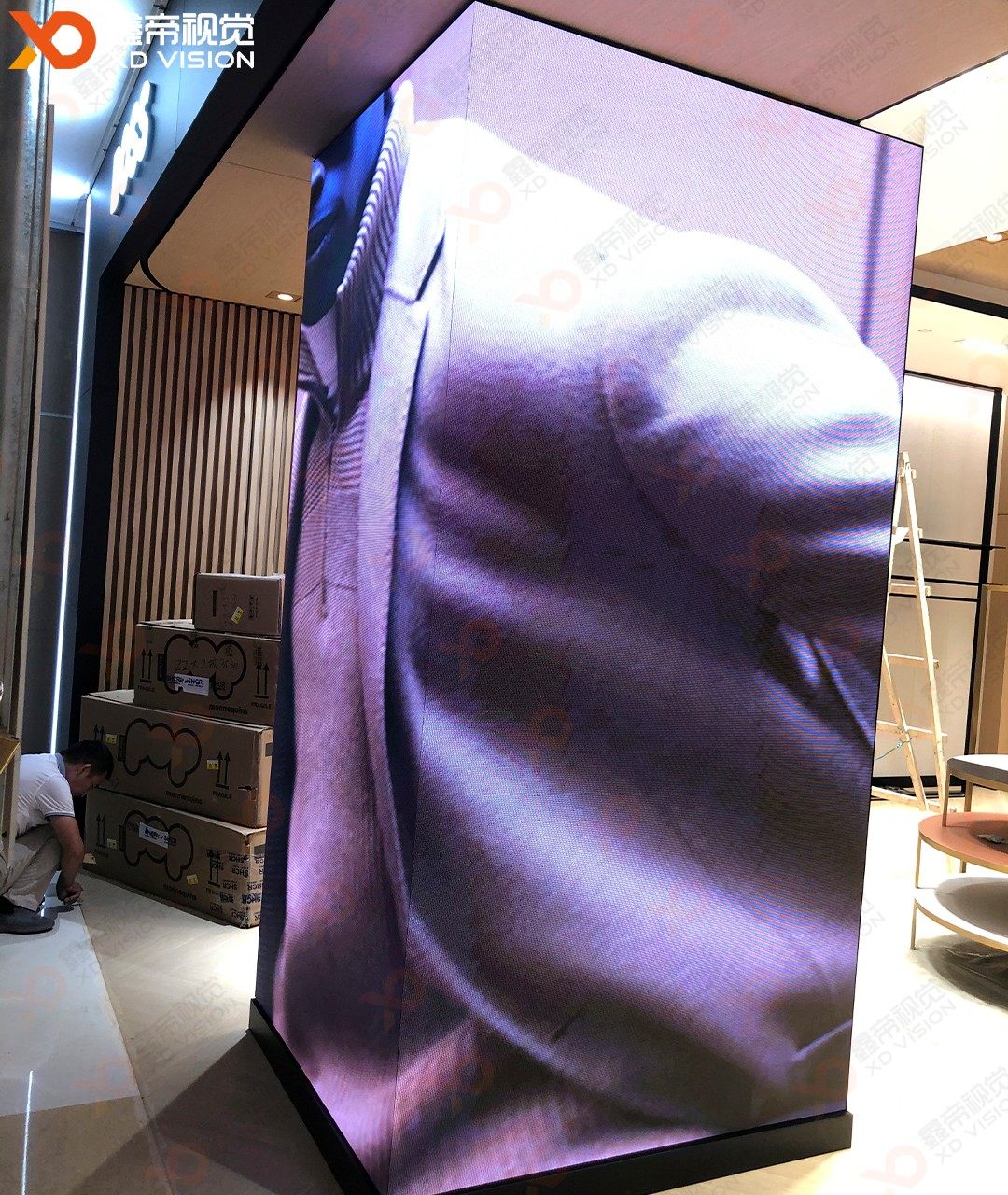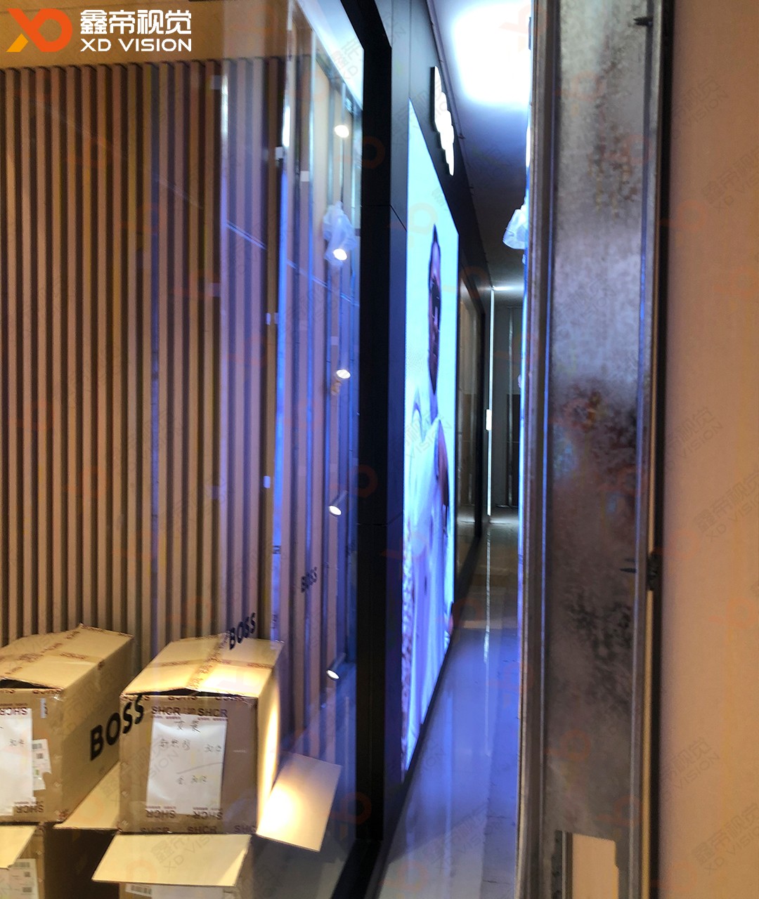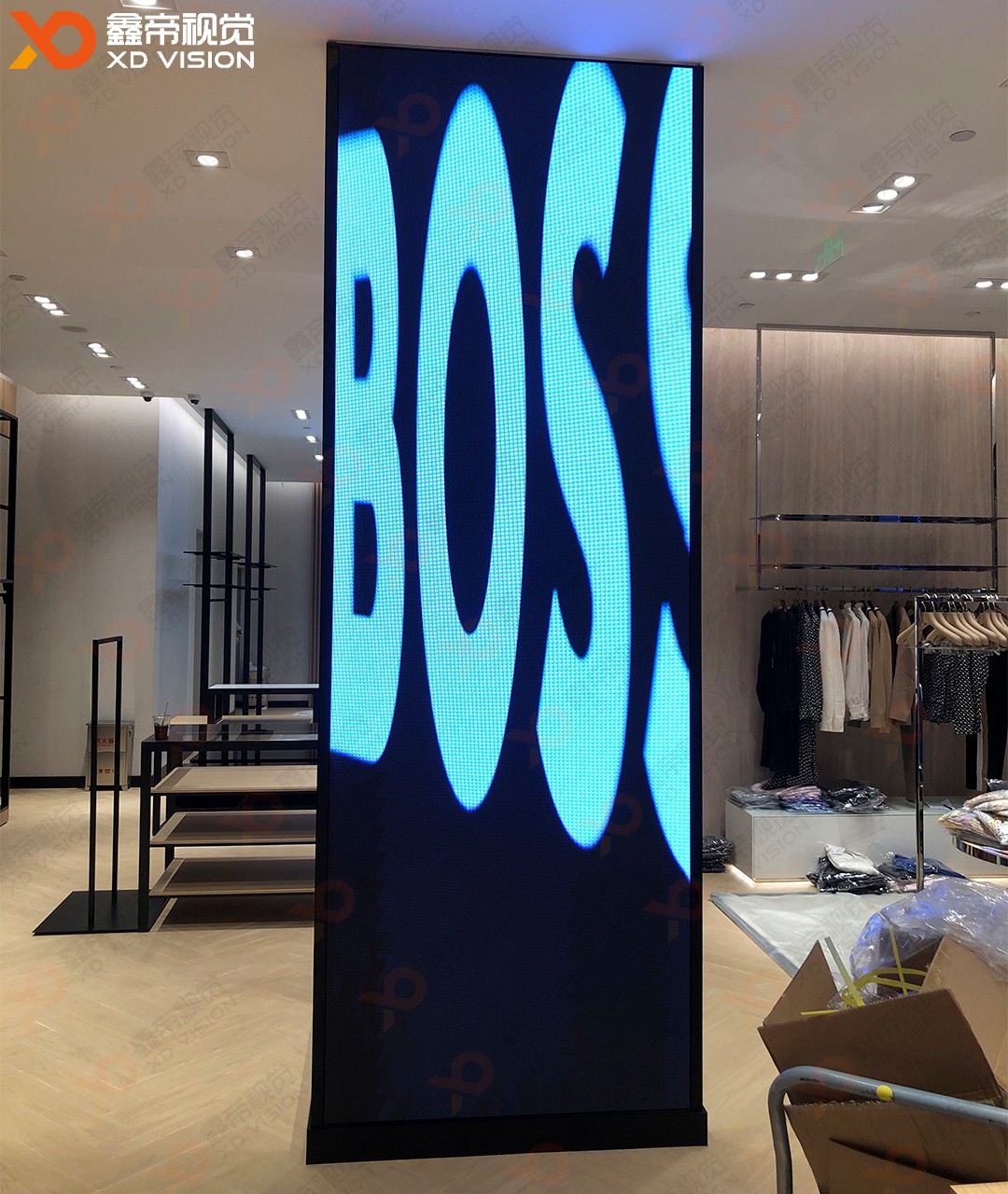 鄭州丹尼斯大衛(wèi)城BOSS專賣店三塊異型定制LED商顯項(xiàng)目安裝調(diào)試完成,整體LED屏是根據(jù)裝修造型設(shè)計(jì)走的,采用了三款異型定制LED模組:160*120mm、160*105mm、160*75mm外加切角模組,和裝修造型完美契合,得到客戶高度肯定!