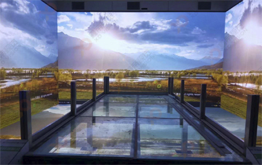 在無縫拼接的LED巨幕沉浸式體驗(yàn)空間內(nèi),將情景、音效同步結(jié)合,使體驗(yàn)者完全沉浸在一個(gè)被立體畫面包圍的高級(jí)虛擬仿真環(huán)境中。